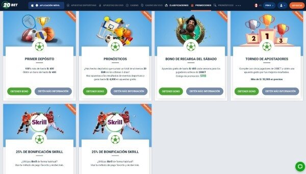 A estas ofertas se pueden sumar otras relacionadas con eventos deportivos o métodos de pago específicos. Por ejemplo, el bono 20Bet por recarga con Skrill que te brinda un 25% de bonificación para tus depósitos con este servicio. Por supuesto, también encontrarás promociones para la sección de casino online. Recuerda consultar la página de ofertas y bonos para confirmar la disponibilidad de las diferentes “promos” y repasar los términos y condiciones asociados a cada una de ellas.
