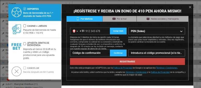 Por igual, si decidiste hacerlo a través de telefonía móvil podrás hacer la confirmación por medio de un código que te llegará vía SMS. Otra forma de realizar la inscripción es directamente mediante tus cuentas de Twitter o Facebook. Esta modalidad es la más sencilla para muchos usuarios y algo diferente con respecto a otros sitios de apuestas online.