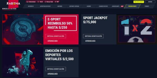 Si eres amante de las ofertas y bonificaciones para tener más fondos en tu cuenta y aprovechar todas las oportunidades disponibles, Rabona apuestas te complacerá sin problemas con una sólida sección de promociones. Esto no se lo reduce a los usuarios nuevos sino también a clientes ya registrados, por lo que hay muchos beneficios que pueden maximizar tu experiencia regularmente.