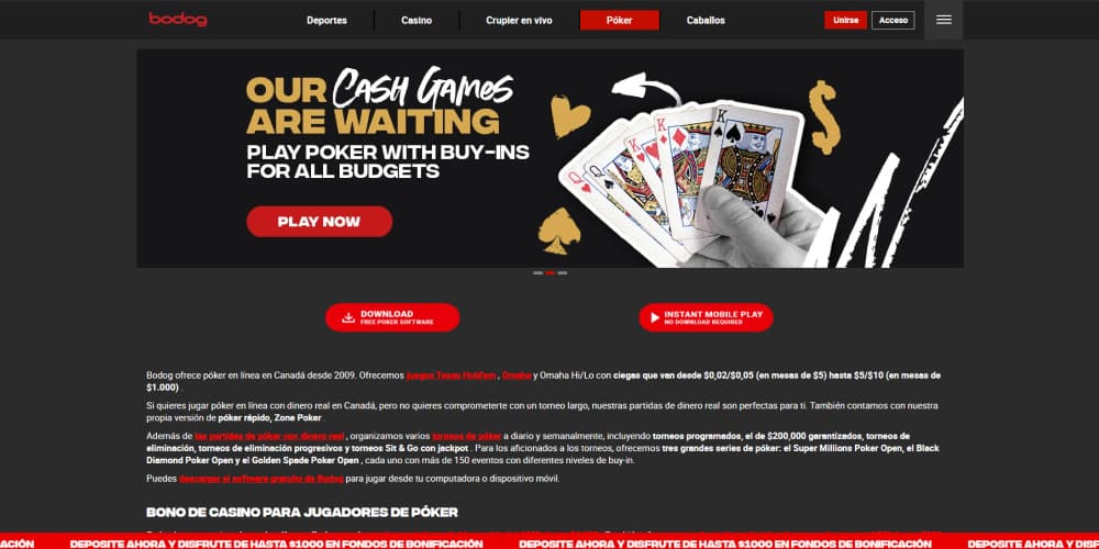 El entorno de juego está diseñado para ofrecer una navegación fluida tanto en escritorio como en móvil, permitiéndote acceder fácilmente a todas las funciones, desde el registro hasta la gestión de tus fondos. Bodog también destaca por sus torneos temáticos, como los High Roller Wednesdays, los freerolls nocturnos con una bolsa para repartir y los Sunday Specials, que añaden variedad y emoción cada semana. Siempre hay juegos de poker online activos, con oportunidades nuevas que te permiten mejorar tu desempeño. Si buscas una forma entretenida y dinámica de participar, con torneos constantes y recompensas por tu constancia, Bodog es una opción que vale la pena considerar.